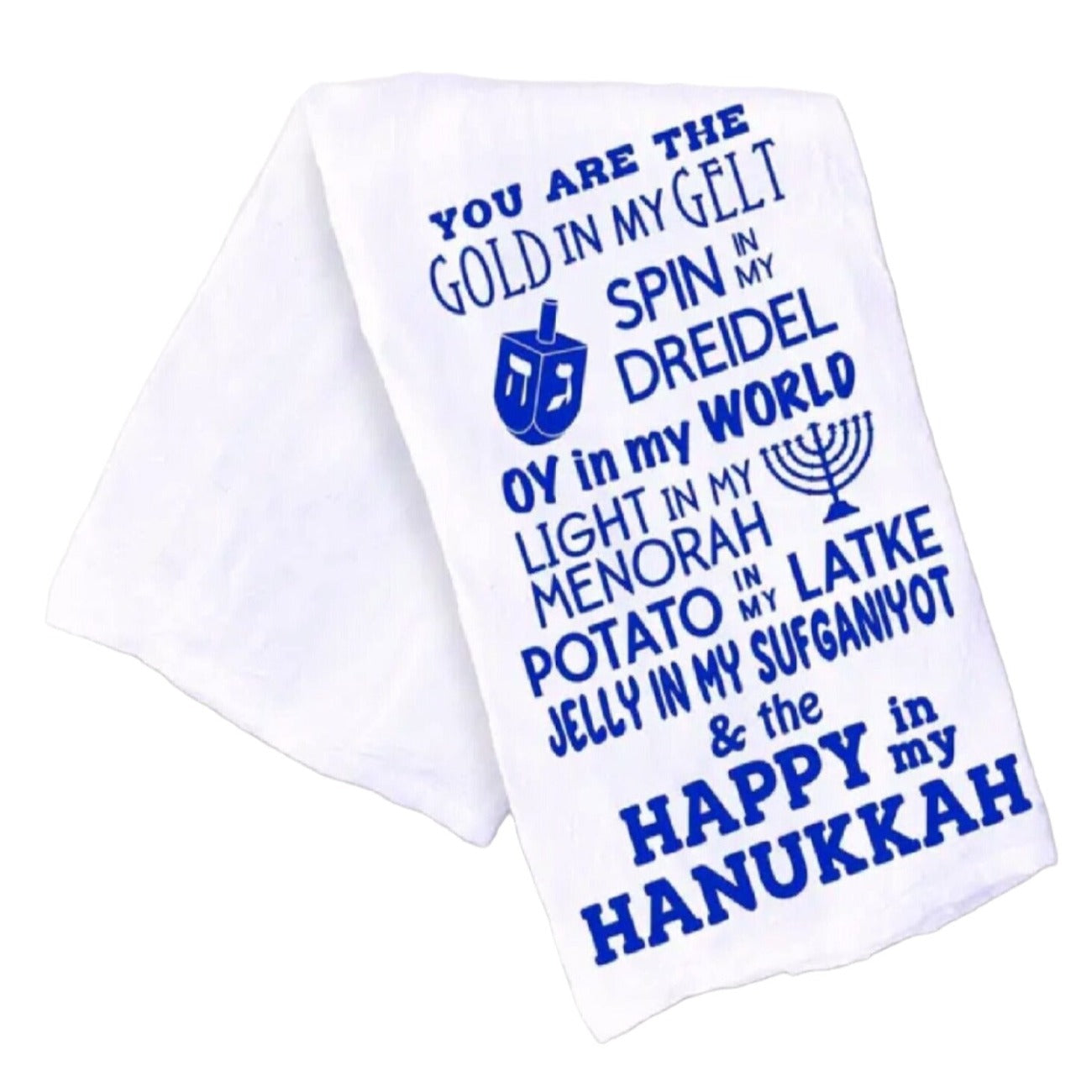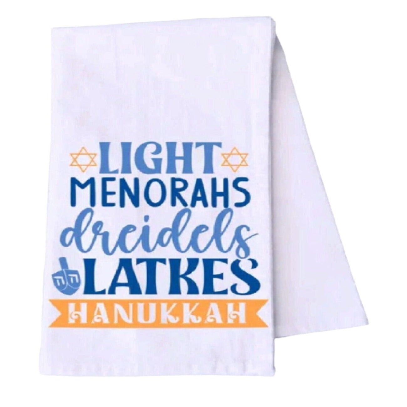 Celebrate Hanukkah with this screen printed Gelt, Dreidel, Latkes, All Things Hanukkah Chanukah Kitchen Towel. Use it in the kitchen for your dishes or as an accessory as...