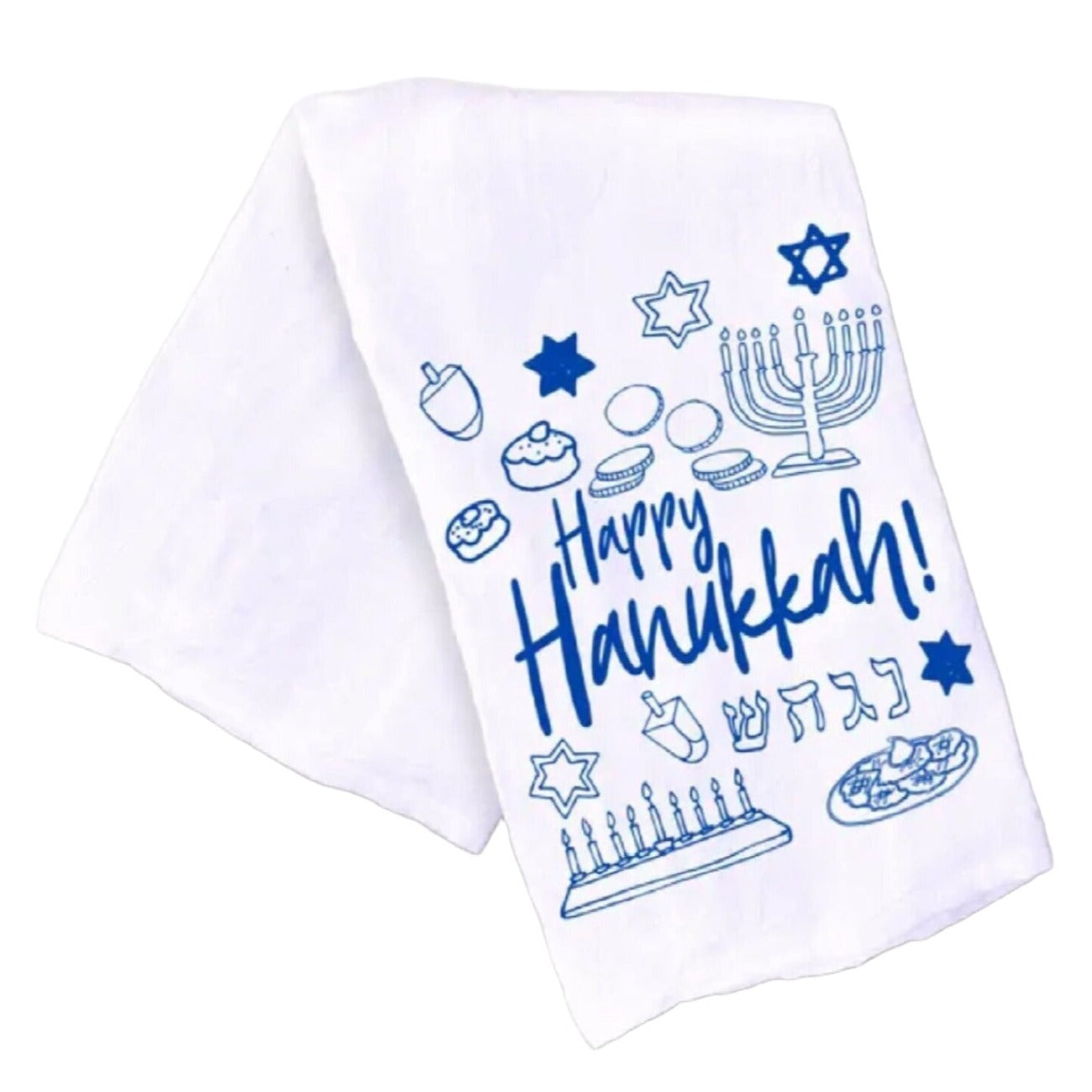 Celebrate Hanukkah with this screen printed Happy Hanukkah Chanukah Icons Hand and Kitchen Towel, Use it in the kitchen for your dishes or as an accessory as a...