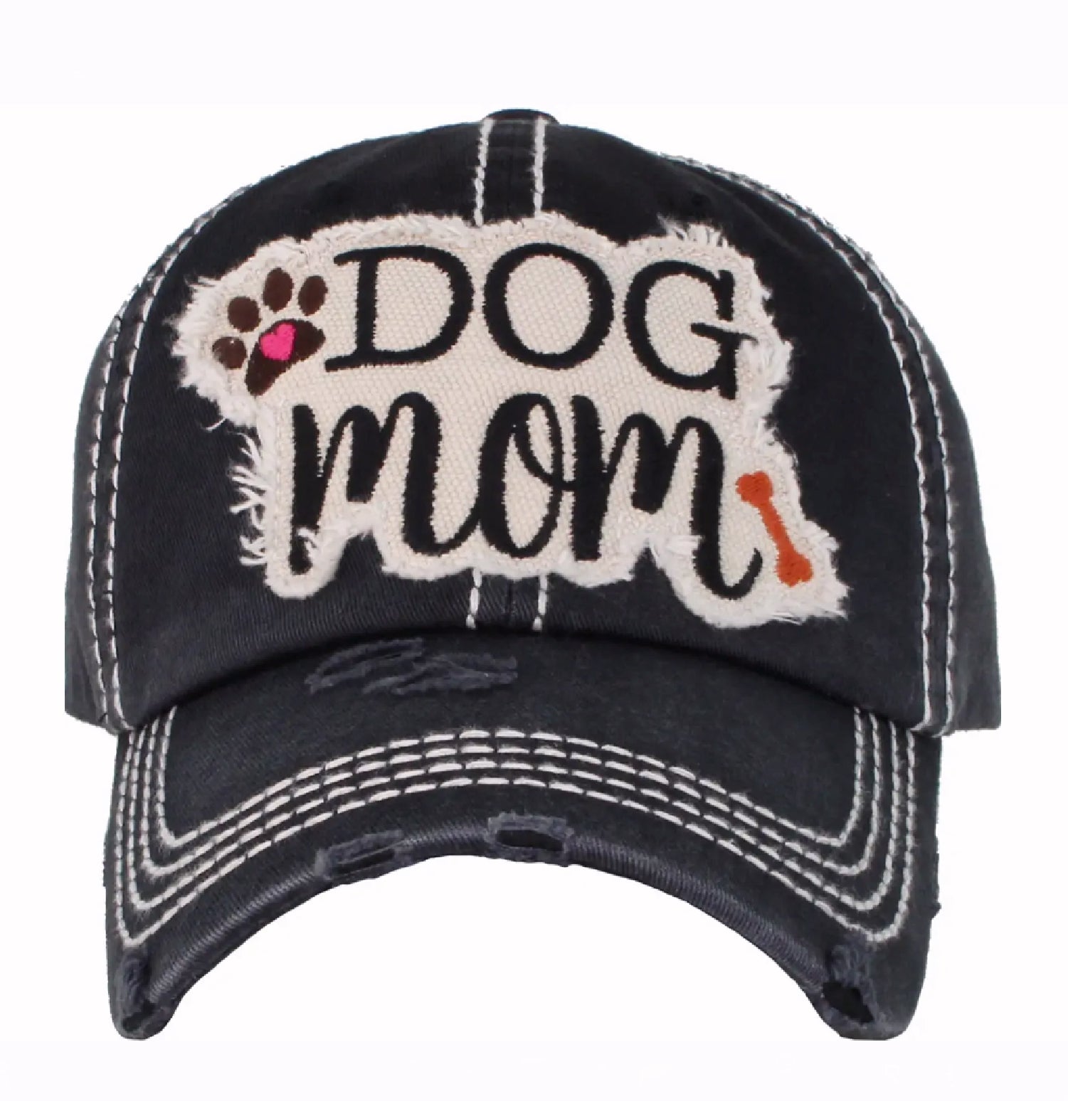Make sure to show your puppy love and pride with our Dog Mom Distressed Grey Black Cap Hat. One Size Fits Most 6 Panel Cap Embroidered Applique...