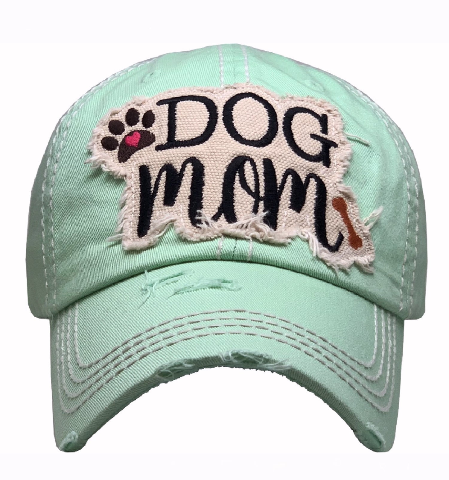 Make sure to show your puppy love and pride with our Dog Mom Distressed Aqua Green Cap Hat. One Size Fits Most 6 Panel Cap Embroidered Applique...