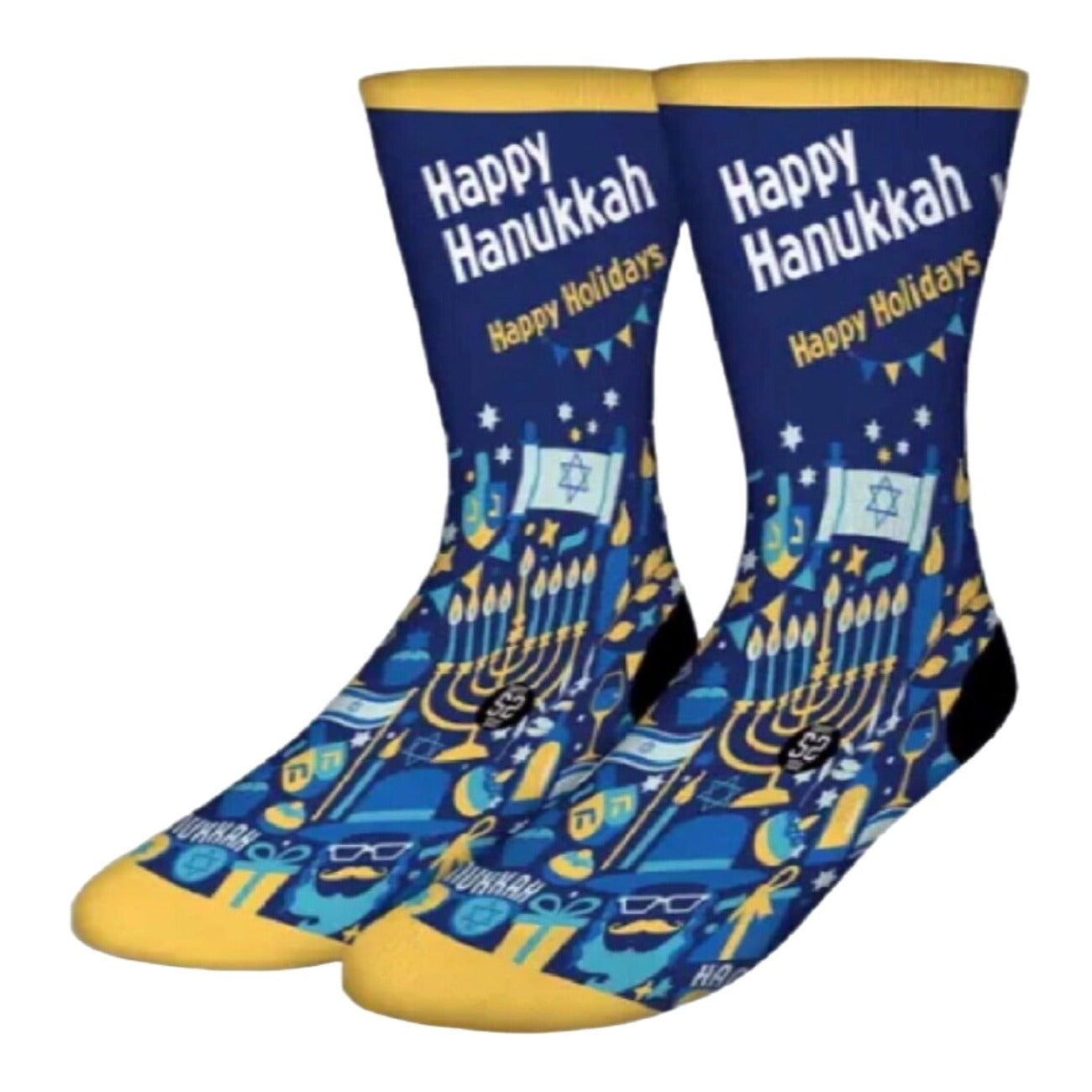 It’s time to get lit for the eight days of Hanukkah with these unique Happy Hanukkah Happy Holidays Socks. Featuring traditional Judaica designs of the Star of David, Dreidel, Candles, Wine, Rabbi and Presents. Perfect for yourself or gift giving.