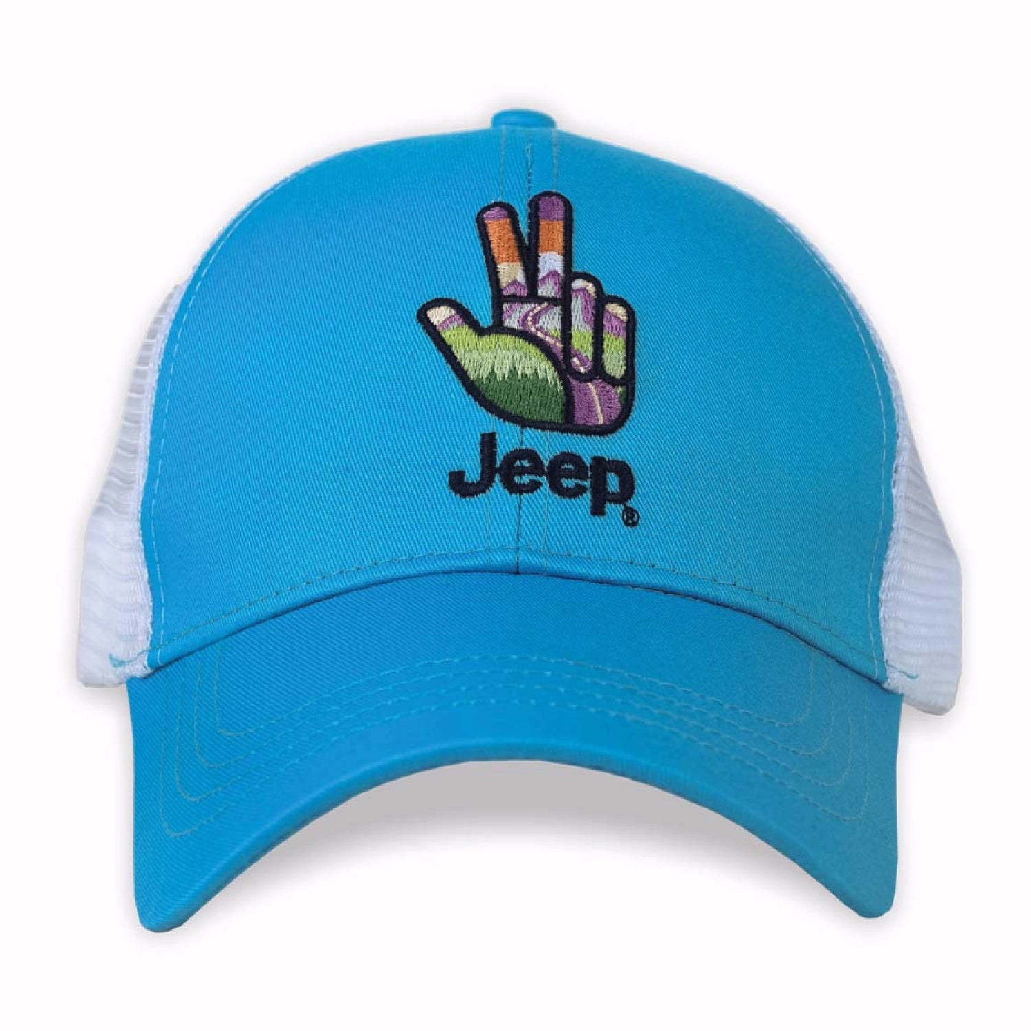 The Jeep® Road Wave Embroidered Mesh Cap Hat features a vibrant embroidered mountain scene within the iconic Jeep Wave.