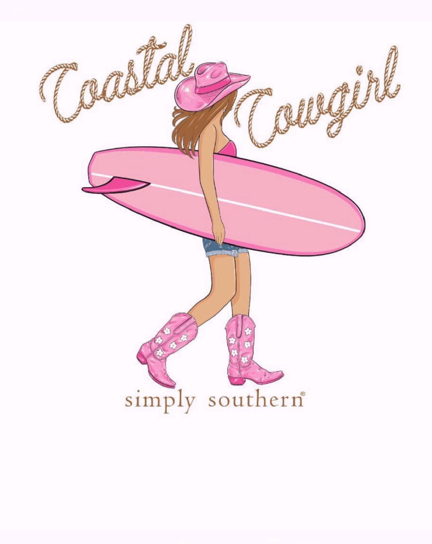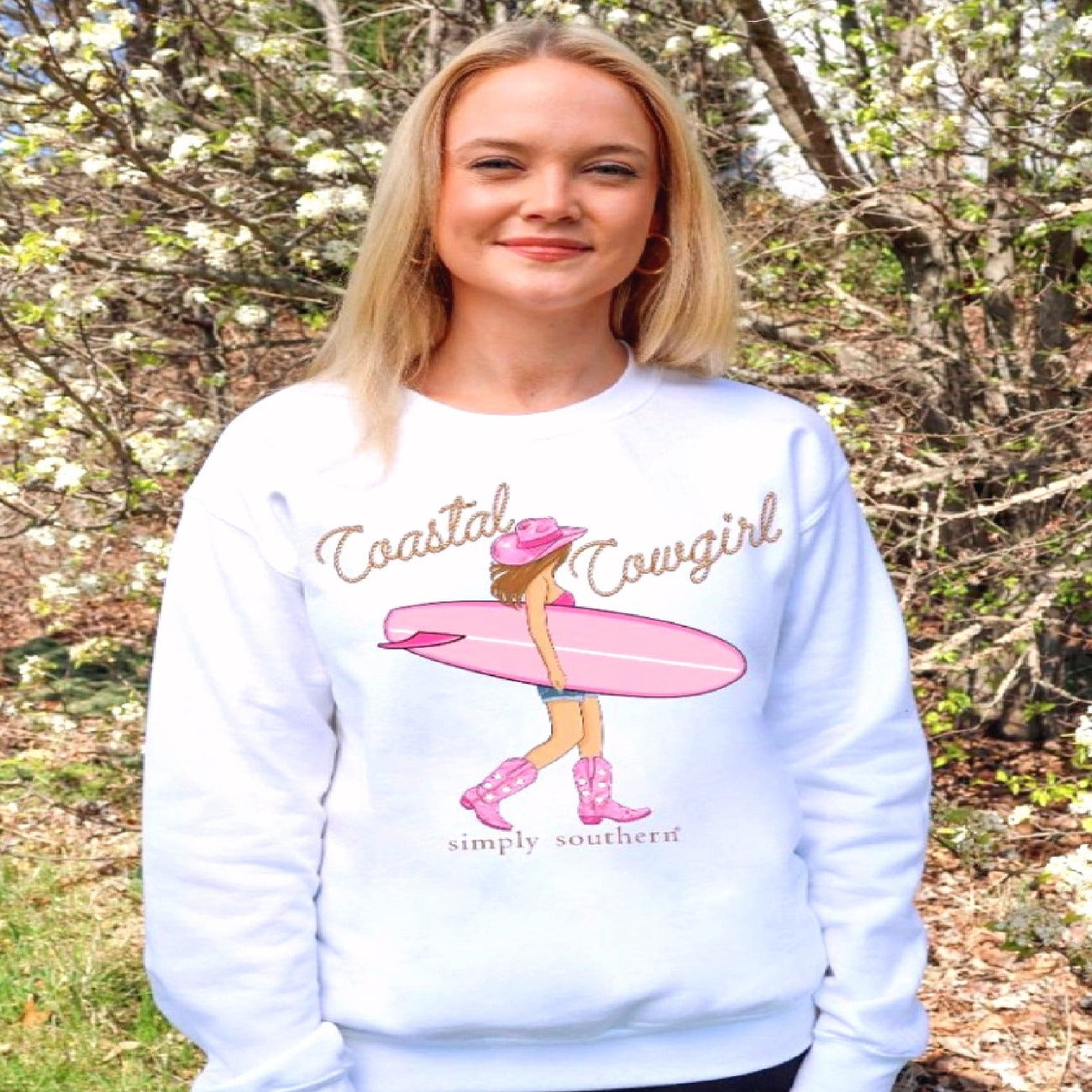 Stay comfy and fashionable in this Simply Southern Coastal Cowgirl Long Sleeve Crew Top. White long sleeve crew with the phrase ‘Coastal cowgirl’ and a lady with cowgirl attire carrying a surf board. Simply Southern logo below and on upper back.